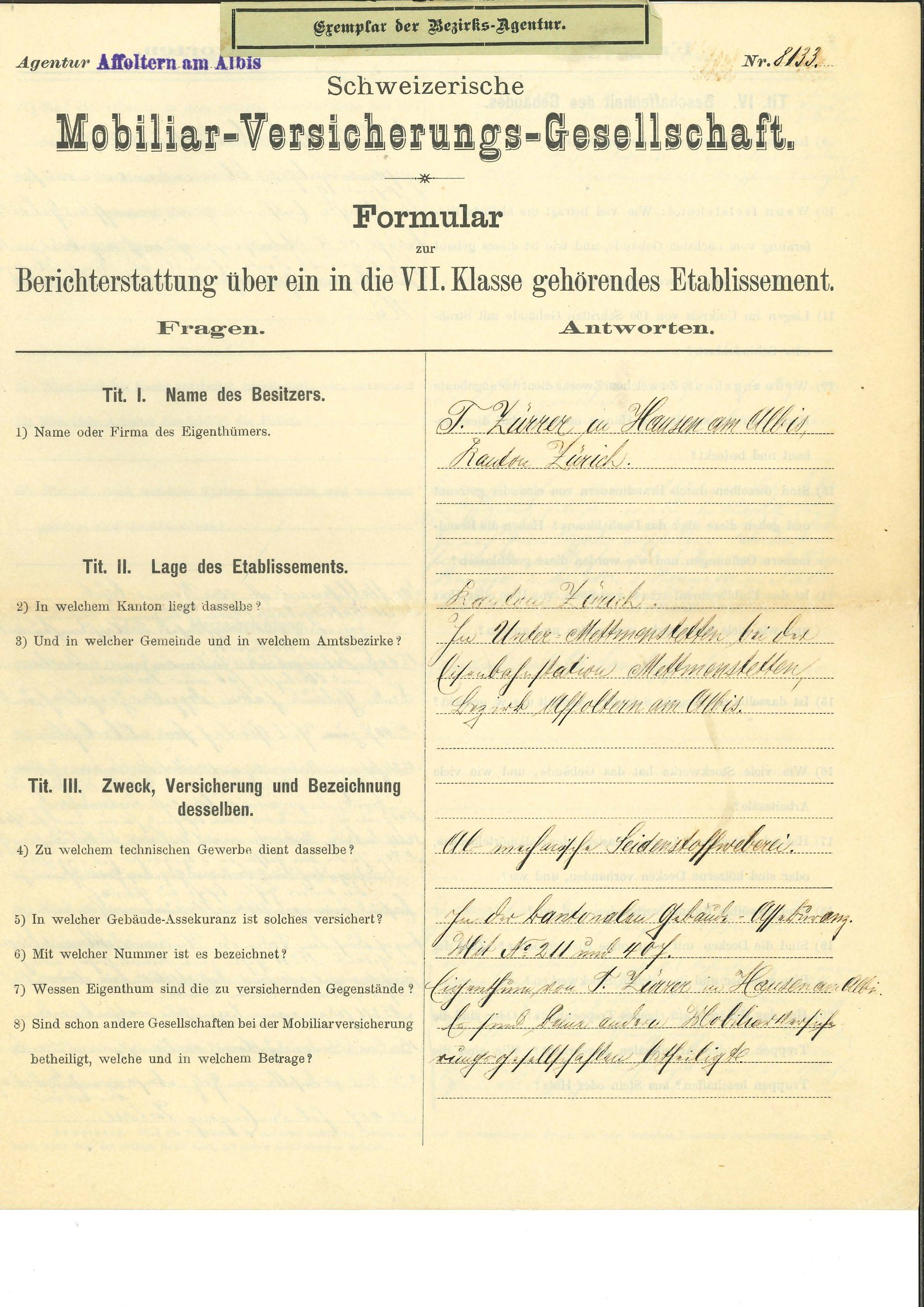 Unter den weiteren Agenten der Gesellschaft in Affoltern, die bis Mitte des 20. Jahrhundert meist nebenamtlich für die Mobiliar tätig waren, befinden sich Gerichtspräsidenten, Statthalter und ein Hauptmann.