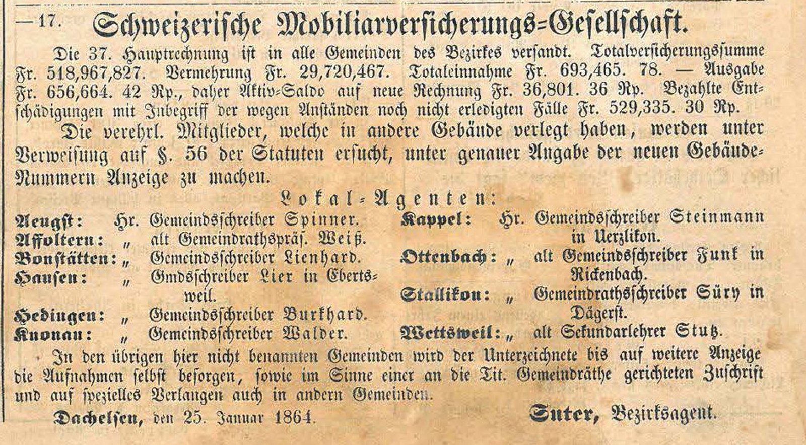 Zwischen 1864 und 1893 trugen die aufeinander folgenden Vertreter der Mobiliar alle den Nachnamen Suter. Vermutlich gehörten sie der gleichen Familie an.