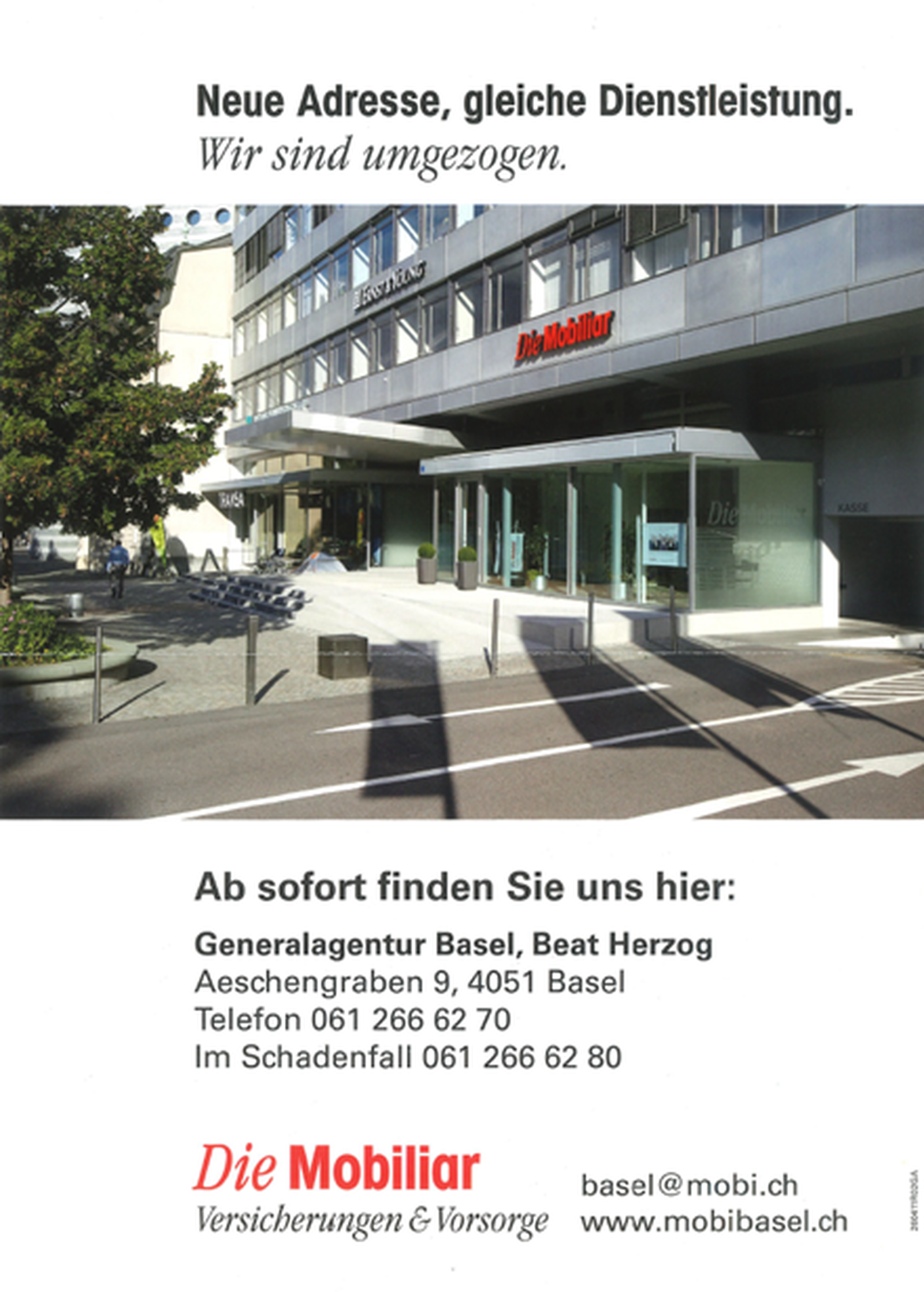 Die Nähe zu den Versicherten gehört seit der Gründung 1826 zur DNA der Mobiliar. Besonders dann, wenn ein Schaden passiert, sind kurze Wege wichtig. Auch in Basel ist die Mobiliar schon seit 1826 präsent.
