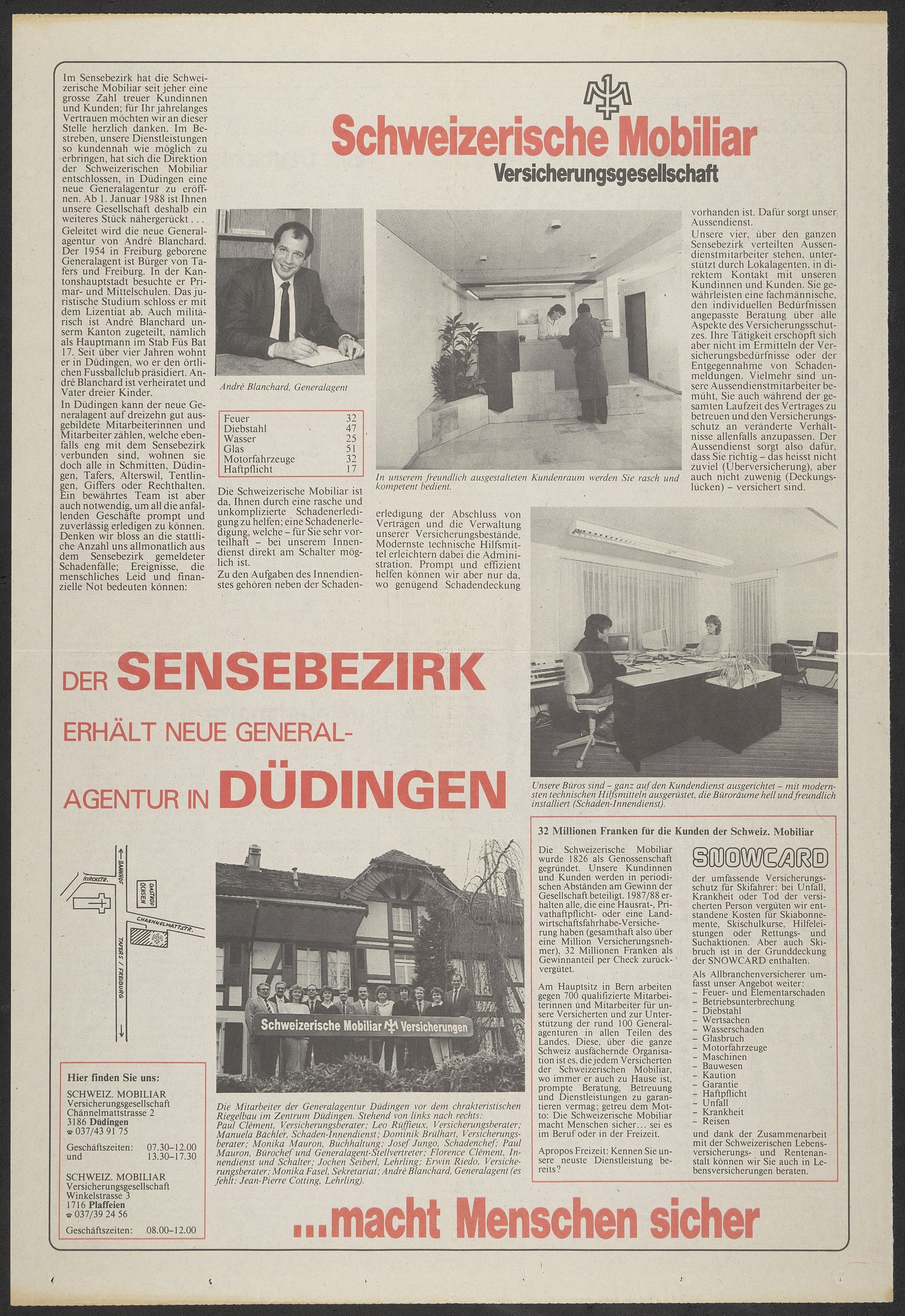 1988 wurde die Generalagentur Düdingen gegründet, die André Blanchard, Sohn des abtretenden Fribourger Generalagenten Edouard Blanchard, als erster Generalagent führte. André Blanchard war später auf der Direktion in Bern als Bereichsleiter der Aussenorganisation und Marktleiter tätig.