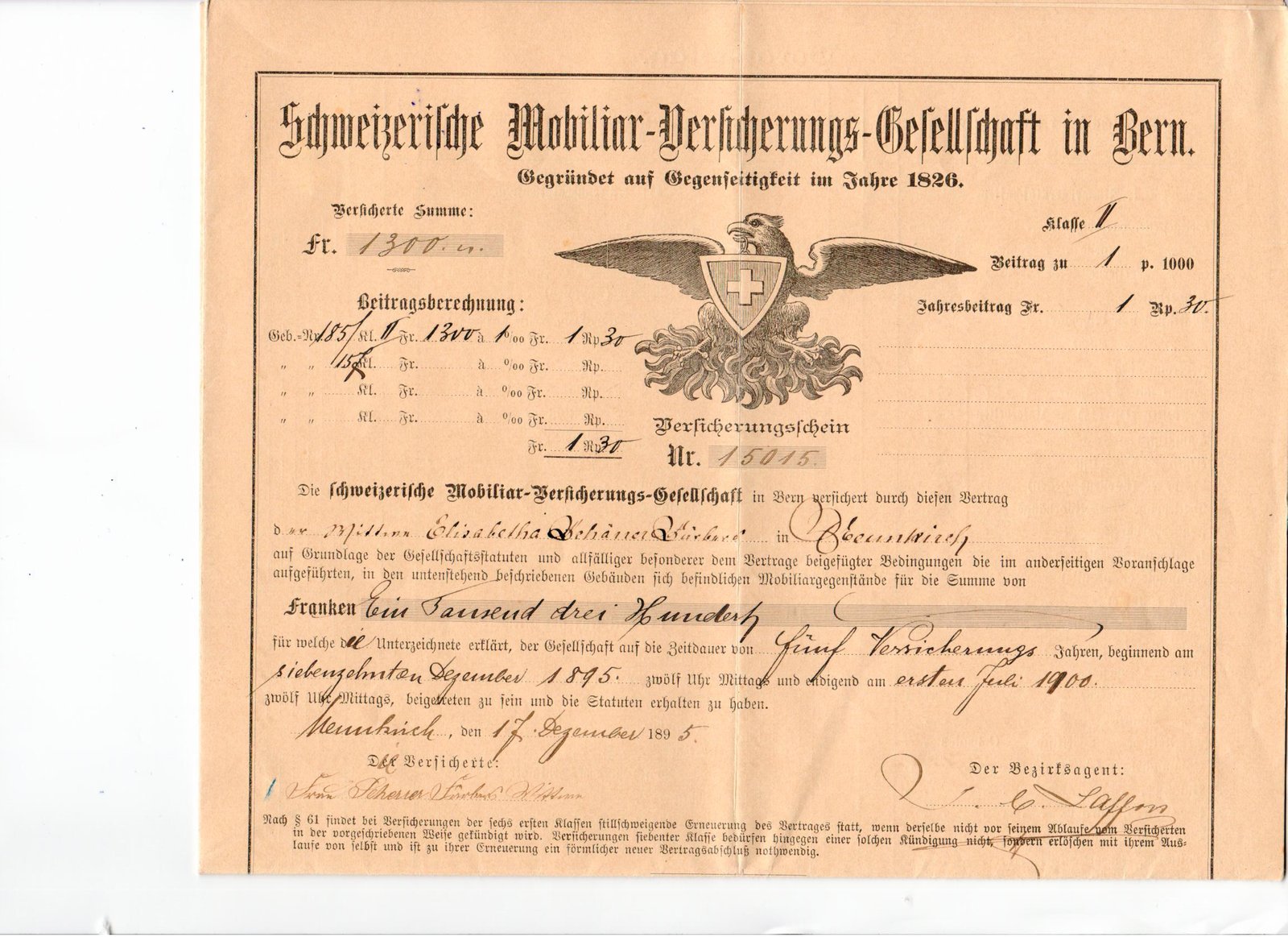 1869 übernimmt die Mobiliar die Haftung für die Explosion des Dampfschiffs «Rheinfall» bei Berlingen, bei der fünf Menschen sterben. Die Mobiliar zahlt der Dampfschiffverwaltung 78‘000 Franken aus. Gehoben und repariert, verkehrt das Schiff unter dem Namen «Neptun» bis 1939, auf Untersee und Rhein.