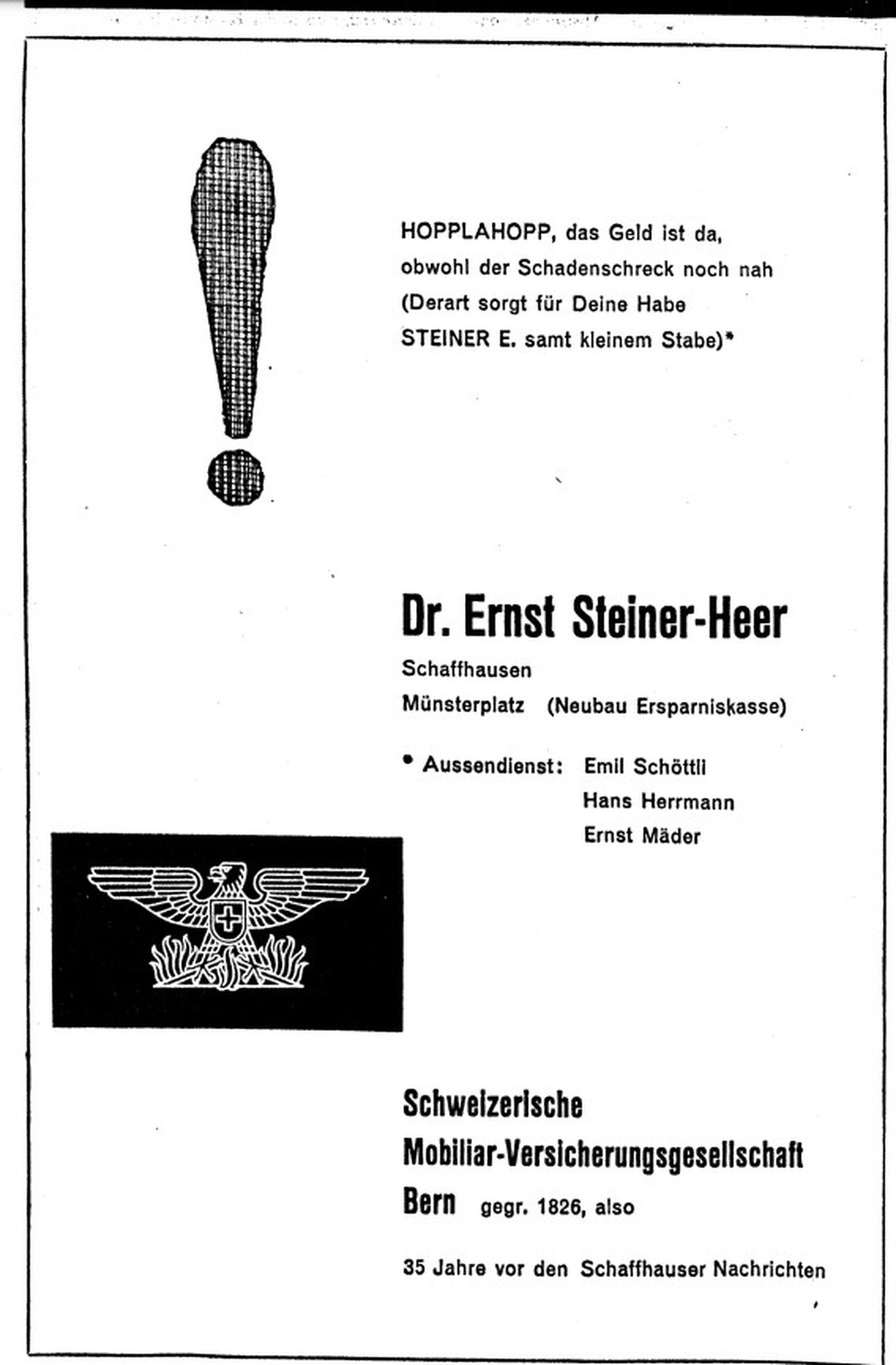 Die Nähe zu den Versicherten gehört seit der Gründung 1826 zur DNA der Mobiliar. Besonders dann, wenn ein Schaden passiert, sind kurze Wege wichtig. Auch in der Region Schaffhausen ist die Mobiliar schon seit ihren Anfängen präsent.
