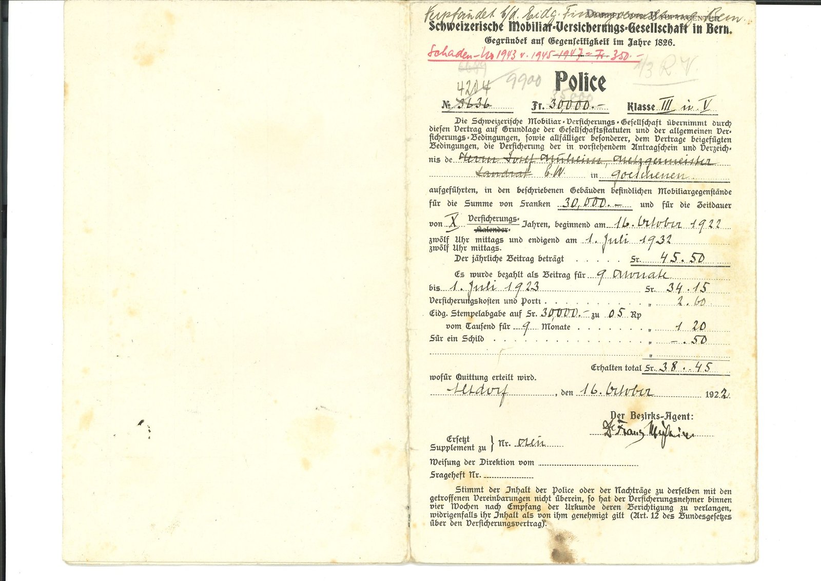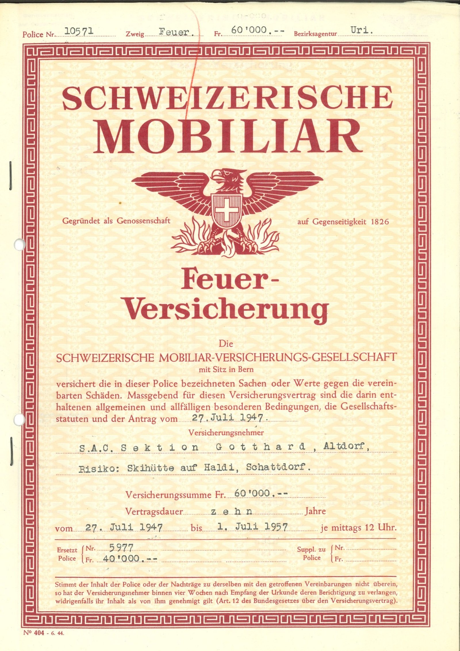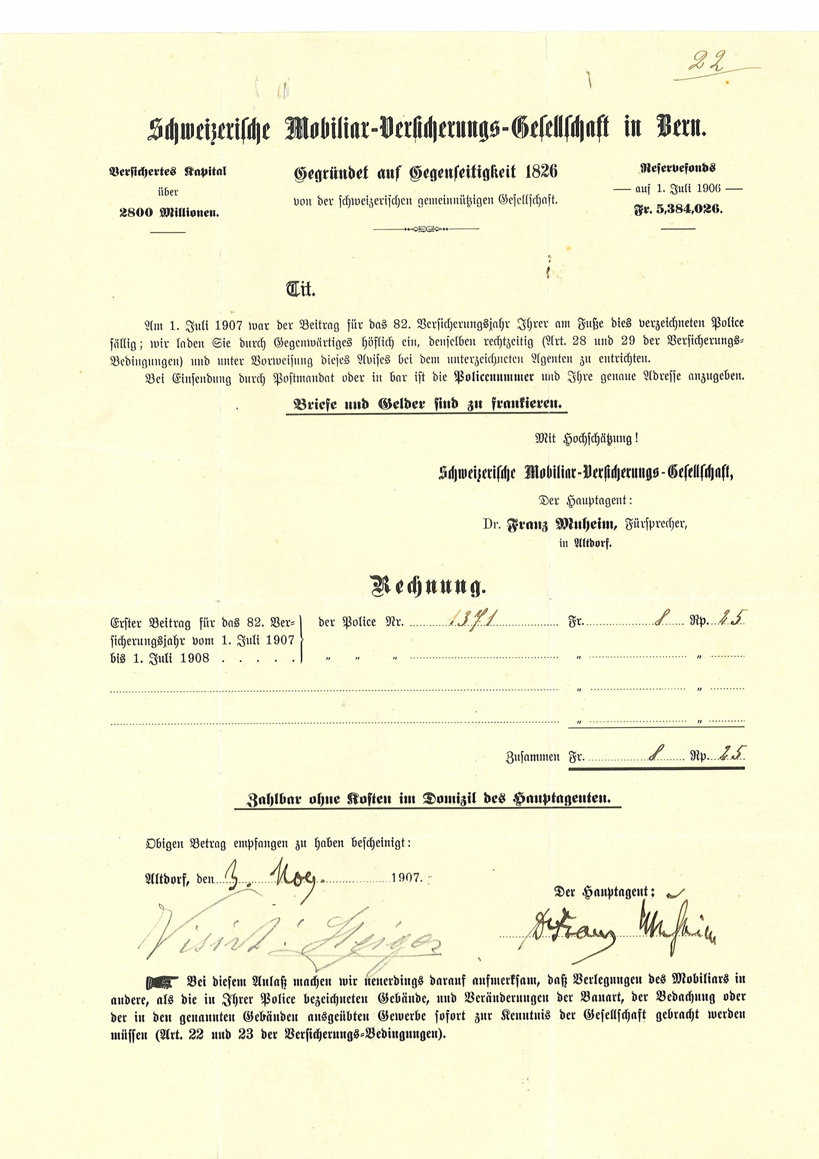 Vor der Eröffnung der Agentur im Kanton Uri wurden schon Versicherungen abgeschlossen und zwar erstmals im neunten Versicherungsjahr (1834/1835) nach Gründung der Mobiliar Versicherung. Die Versicherungssumme betrug Fr. 1’350.- bei einer Prämie von Fr. 1.80.-