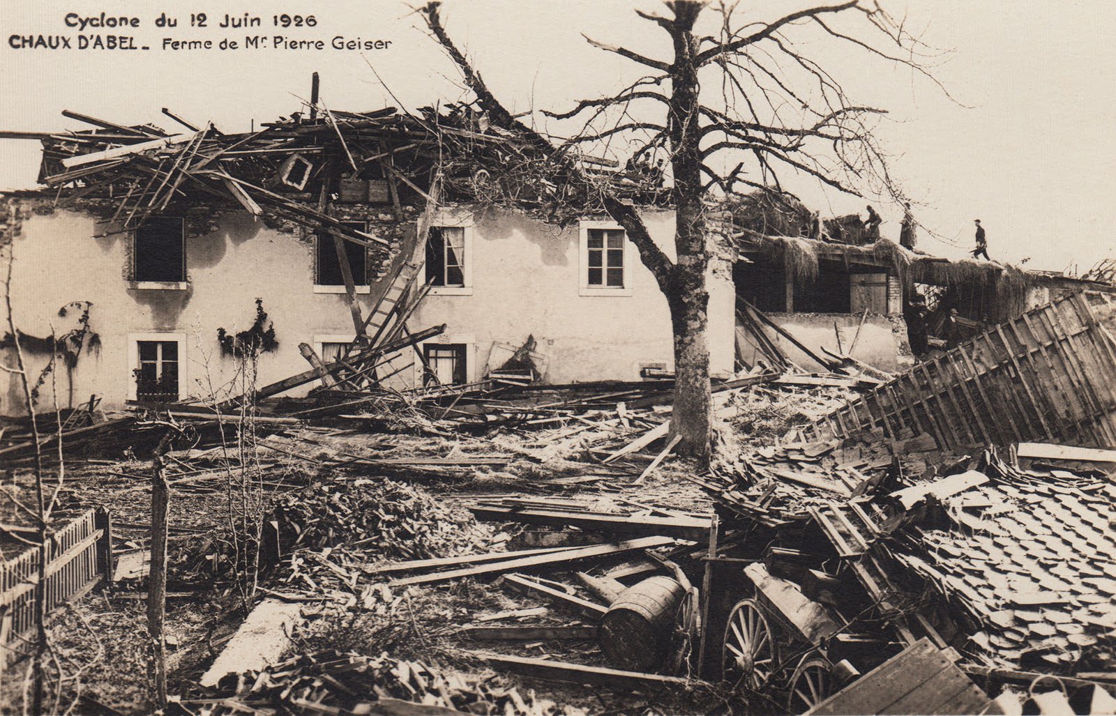 Er ist einer der stärksten Tornados, der je in der Schweiz gemessen wurde. Nach einer halben Stunde ist der Spuk vorbei. In dieser kurzen Zeit hinterlässt er eine Schneise der Verwüstung, 23 Kilometern lang und 300 bis 1000 Meter breit. Ein Junge stirbt. Es gibt einige Schwerverletzte, unzählige tote Tiere und Sachschäden in Millionenhöhe. Auch der Hof der Familie Geiser in La Chaux-d’Abel, der auf dem Schadenbild der Mobiliar zu sehen ist, wird schwer getroffen.