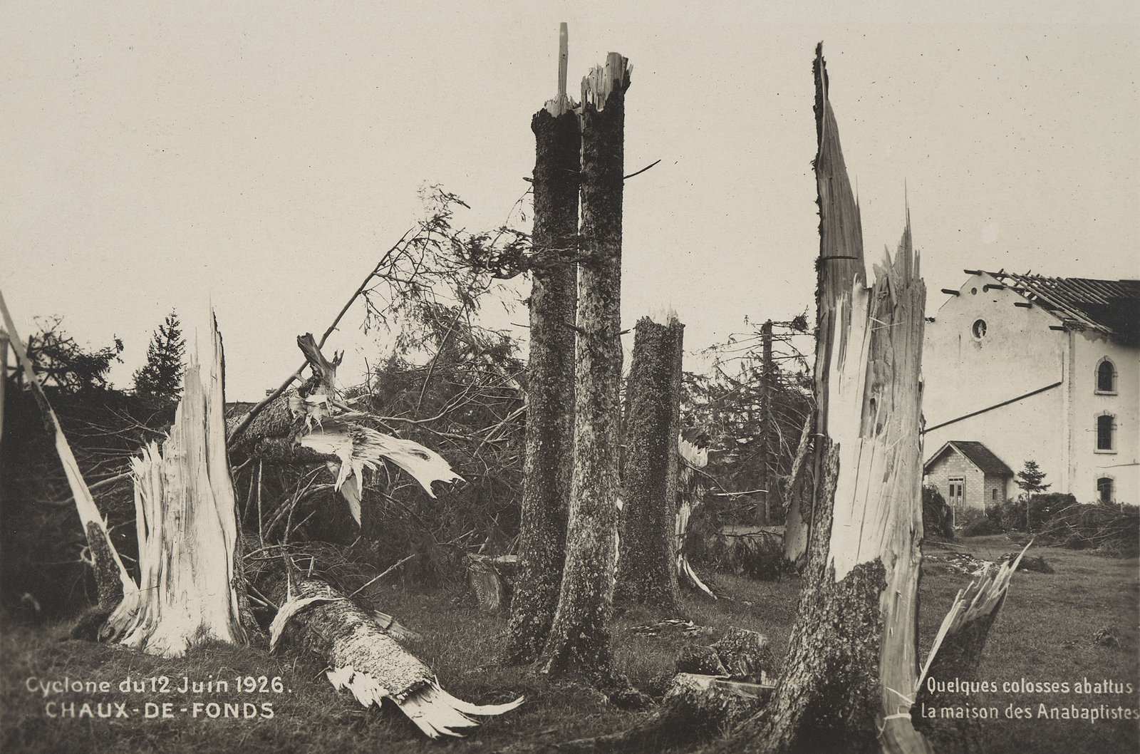 Es ist der 12. Juni 1926. Der Nachmittag ist schwül, Gewitter ziehen auf. Im französischen Département Doubs bildet sich nahe der Grenze ein Wirbelsturm. Er nimmt Kurs auf den Neuenburger und Berner Jura. Augenzeugen berichten, wie es plötzlich dunkel wird wie in tiefer Nacht. Es blitzt, Staub ist in der Luft und es ertönt ein Lärm wie von 1000 Flugzeugmotoren. Wo der gewaltige Luftwirbel den Boden berührt – in der Gegend um La-Chaux-de-Fonds und La Ferrière – zerlegt er Gebäude und fällt ganze Wälder.