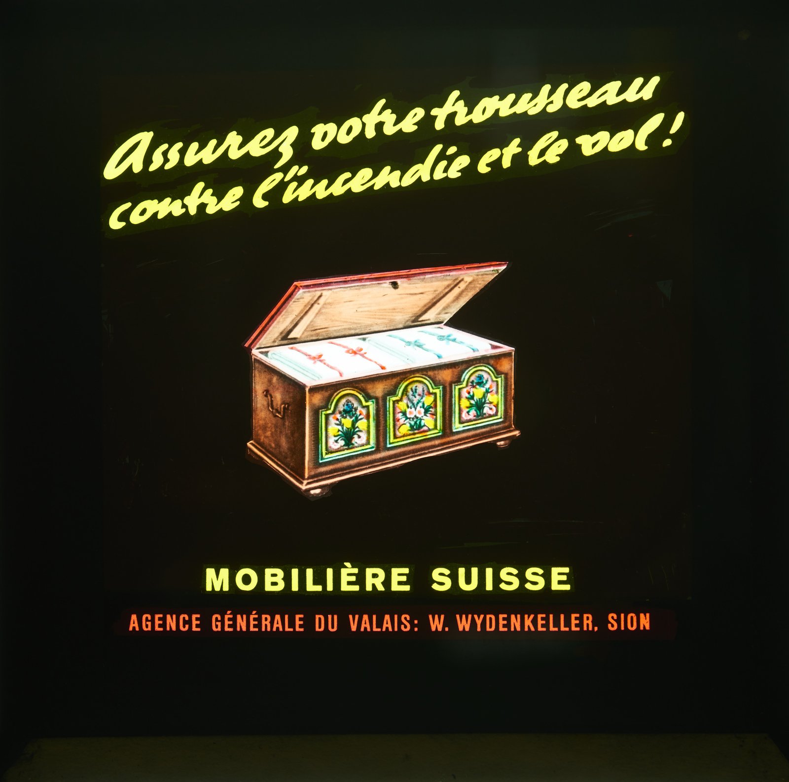 Das Kinodia aus dem Werbearchiv zeigt: Die Aussteuer – die Ausstattung für den zukünftigen Haushalt, die eine Frau in die Ehe mitbrachte – war 1949 eine versicherungswürdige Wertsache. Gesellschaft und Geschlechterrollen wandelten sich seither fundamental und mit ihnen Produkte und Werbung der Mobiliar. Aussteuer? Längst Geschichte. Werbung gelb auf schwarz? Nur noch ein Thema für Young-Boys-Fans.