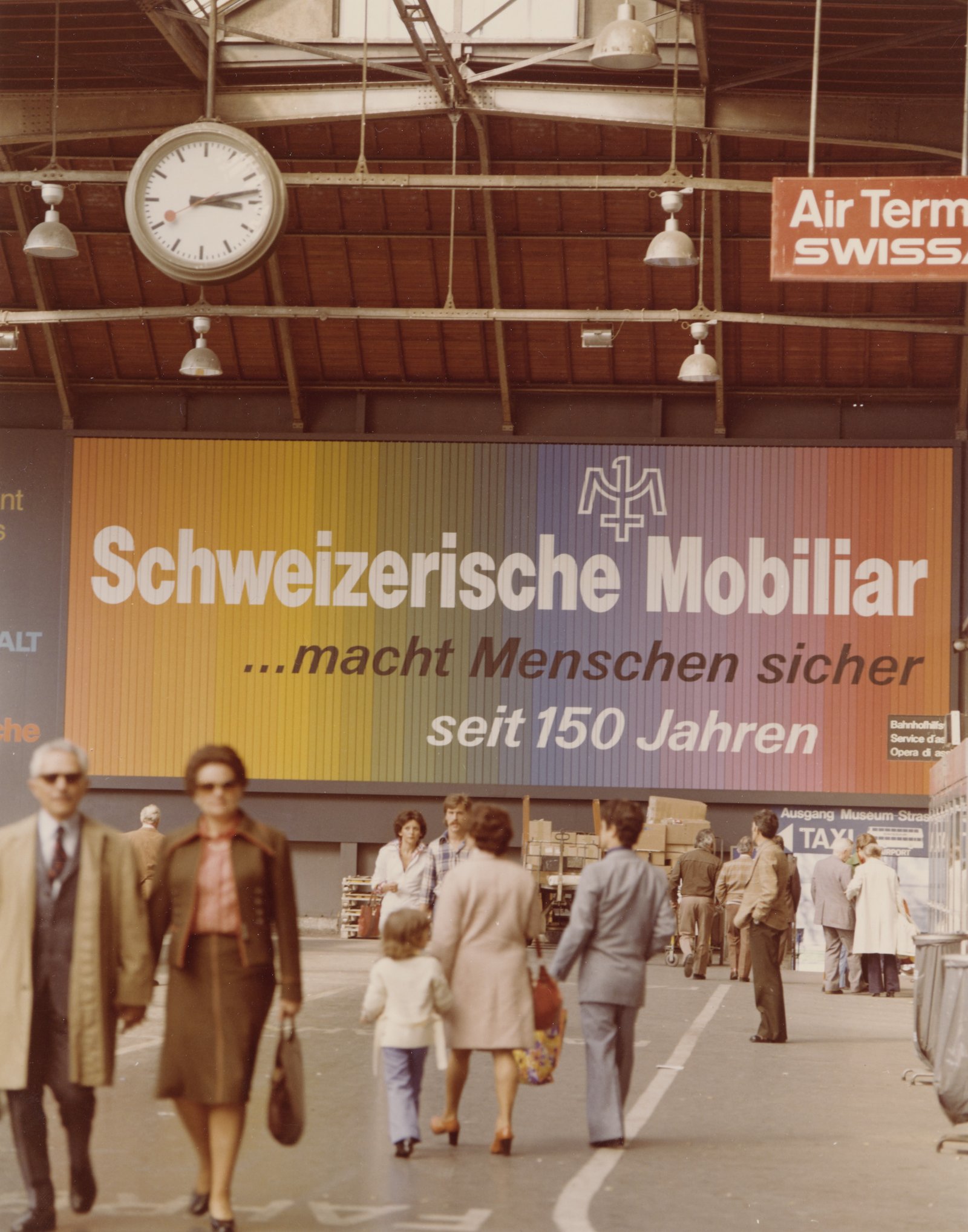 1974, Hauptbahnhof Zürich. «Alle einsteigen, bitte!» ruft der Schaffner auf Gleis 13. Eine elegante Frau eilt vorbei. Schafft sie es rechtzeitig? Von der Rückwand der Bahnhofshalle überblickt ein Mann das Treiben, neben ihm ein stilisierter Phönix und die Botschaft: «Die Schweizerische Mobiliar macht Menschen sicher».