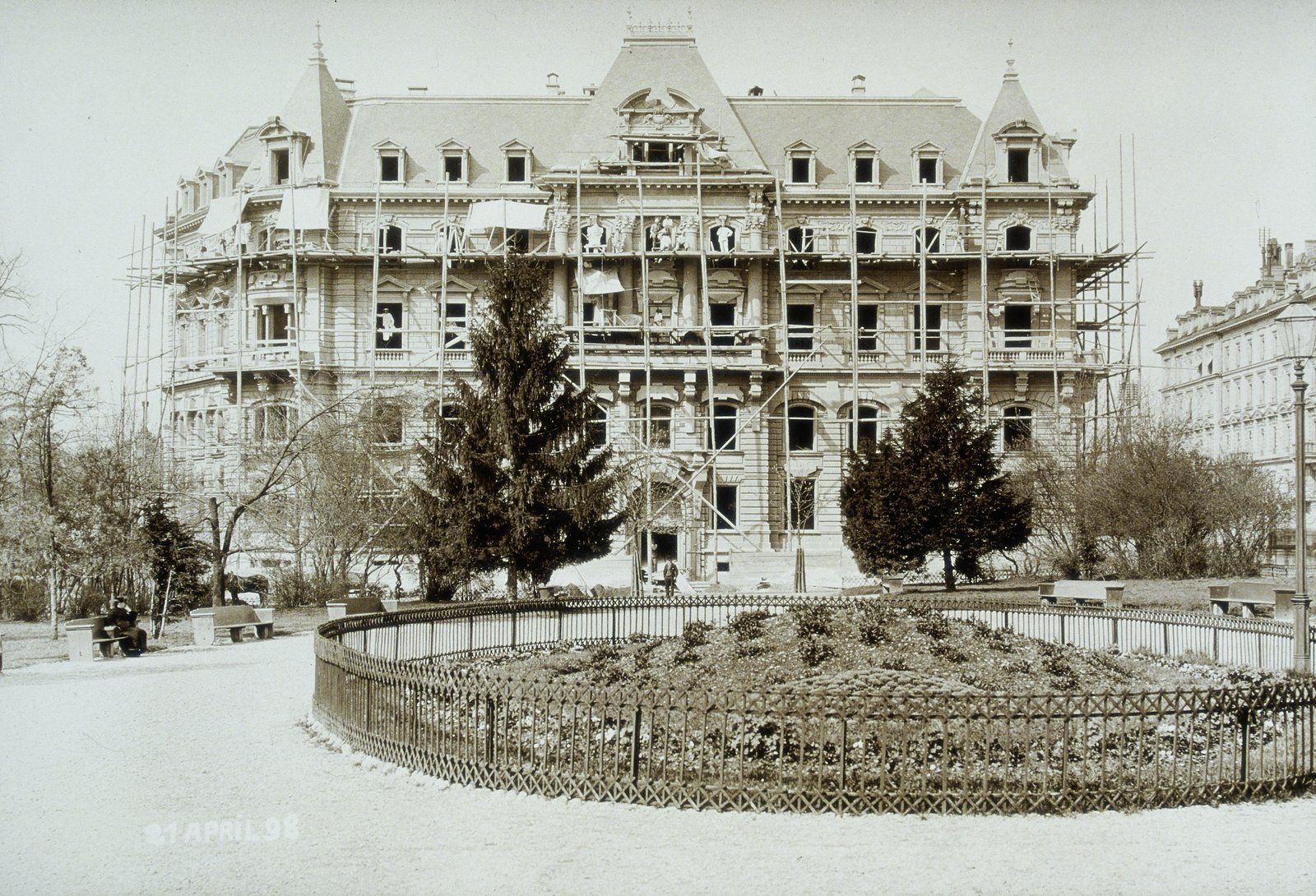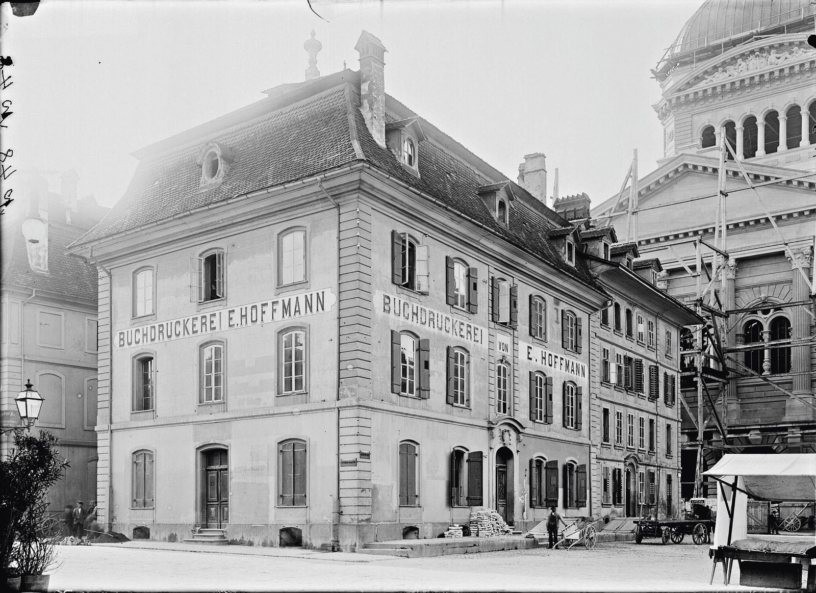 Links angeschnitten steht noch das ehemalige Direktionsgebäude an der Amthausgasse 23, um 1900 für den Bundesplatz abgerissen. Dahinter ist das Bundeshaus fast fertiggestellt.